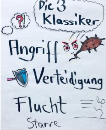 Damit war also er der erste Teil geklärt, wir kennen nun die Situation. Dies brachte uns zur nächsten Frage: Wie setzen wir Humor ein? Im klassischen Schema in Stresssituationen wird Humor nämlich nicht aufgeführt, hier begnügt man sich mit dem Fight/Flight-Schema; Entspannung schafft das auf Dauer nicht.