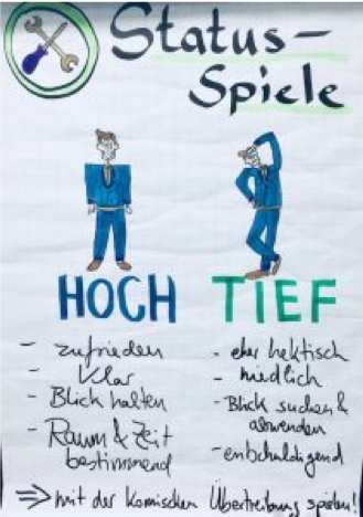 Im letzten Akt des Seminars kam noch der Status in Spiel. In jedem sozialen Raum bildet sich unweigerlich eine Hierarchie aus. Erst recht im Krankenhaus, wo sich cholerischer Oberarzt und sture Patientin die Klinke in die Hand geben. Während der Hochstatus den Ton angibt, fügt sich der Tiefstatus der Situation und mischt sich nicht ein. Diese Hierarchie ist jedoch kein steifes Gebilde, sondern kann sich schnell verändern. Die Kunst eines Rollenwechsels im richtigen Moment ist die erfolgreichste Strategie. Wie wir selbst gemerkt haben kommt es schnell zu Revierkämpfen, sollte jeder den höchsten Status beanspruchen. Die Kunst ist es hier, trotzdem durch positiv gezeigte Autorität voranzukommen und nicht zu versuchen das Gegenüber ad hominem abzuwerten.